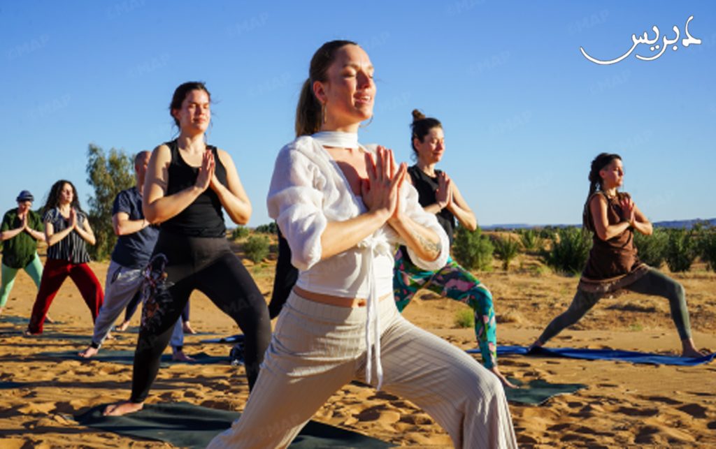 تشير الساعة إلى الخامسة مساء، يتردد صدى قرع آلة “الغونغ” (آلة إيقاعية آسيوية قديمة) عبر أرجاء مخيم سياحي بمرزوكة، معلنا انطلاق حصة لليوغا عند سفح الكثبان الرملية التي تضفي سحرا خاصا على هذه الجنة الطبيعية.